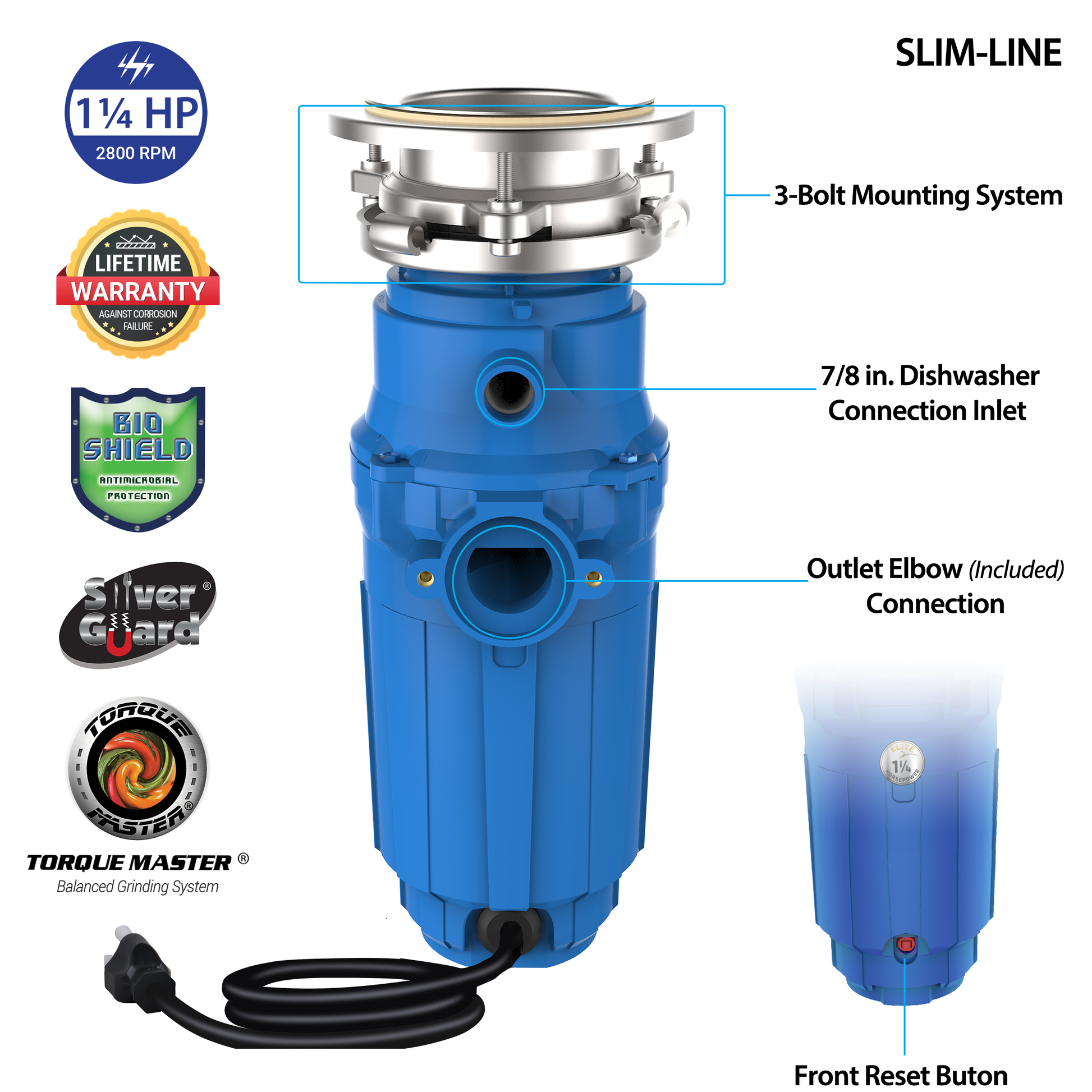 The Slim-Line® offers a full 1.25 HP motor in a compact design that allows for more under-counter space.