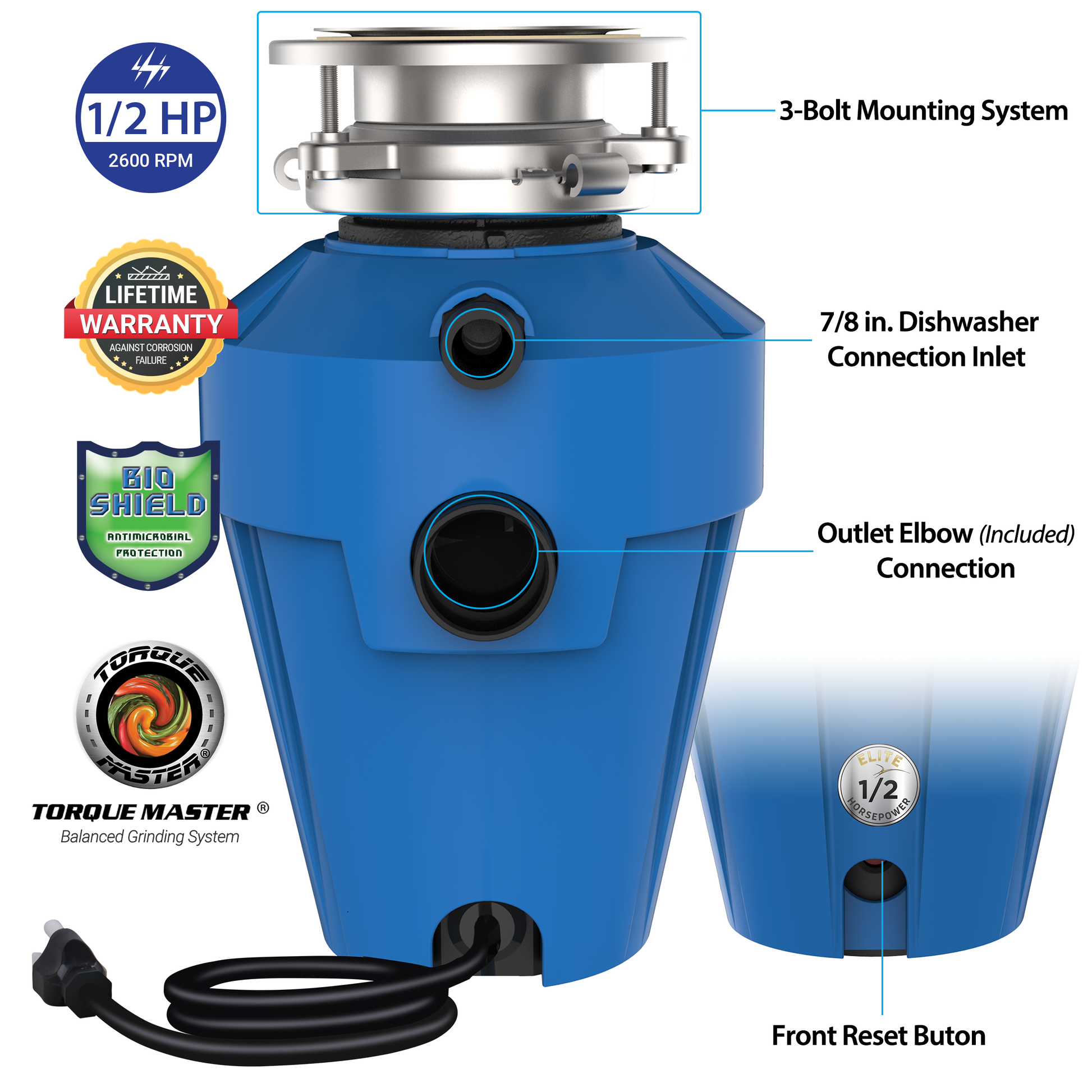 The American Standard Elite 1/2 HP food waste disposer with attached power cord and plug offers a high torque permanent magnet motor and features anti-microbial protection against odor.