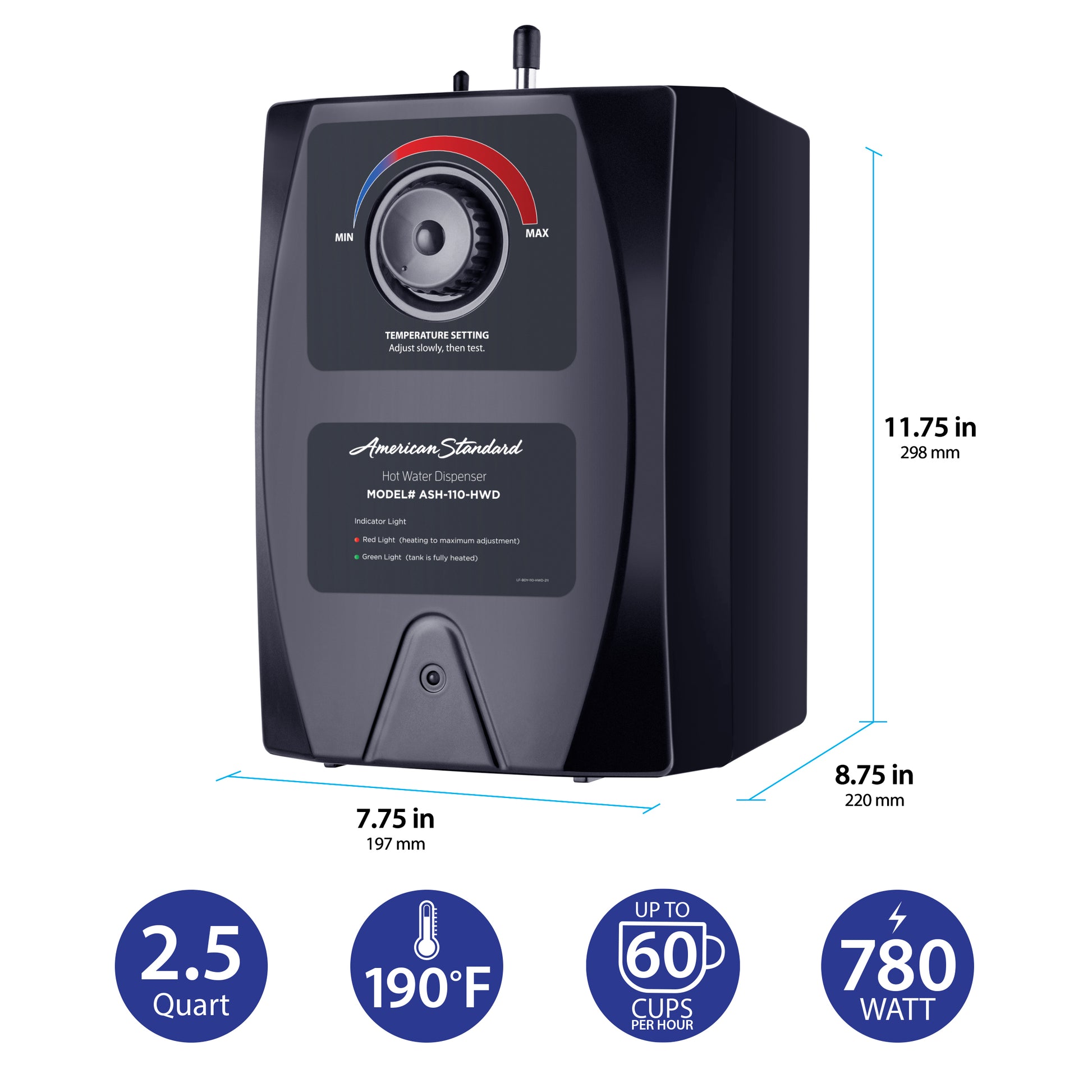 - The 2.5-quart stainless steel under sink hot water tank comes with an energy efficient 110-volt 780-watt stainless steel heating element that allows for fast recovery time, ensuring hot water when you need it