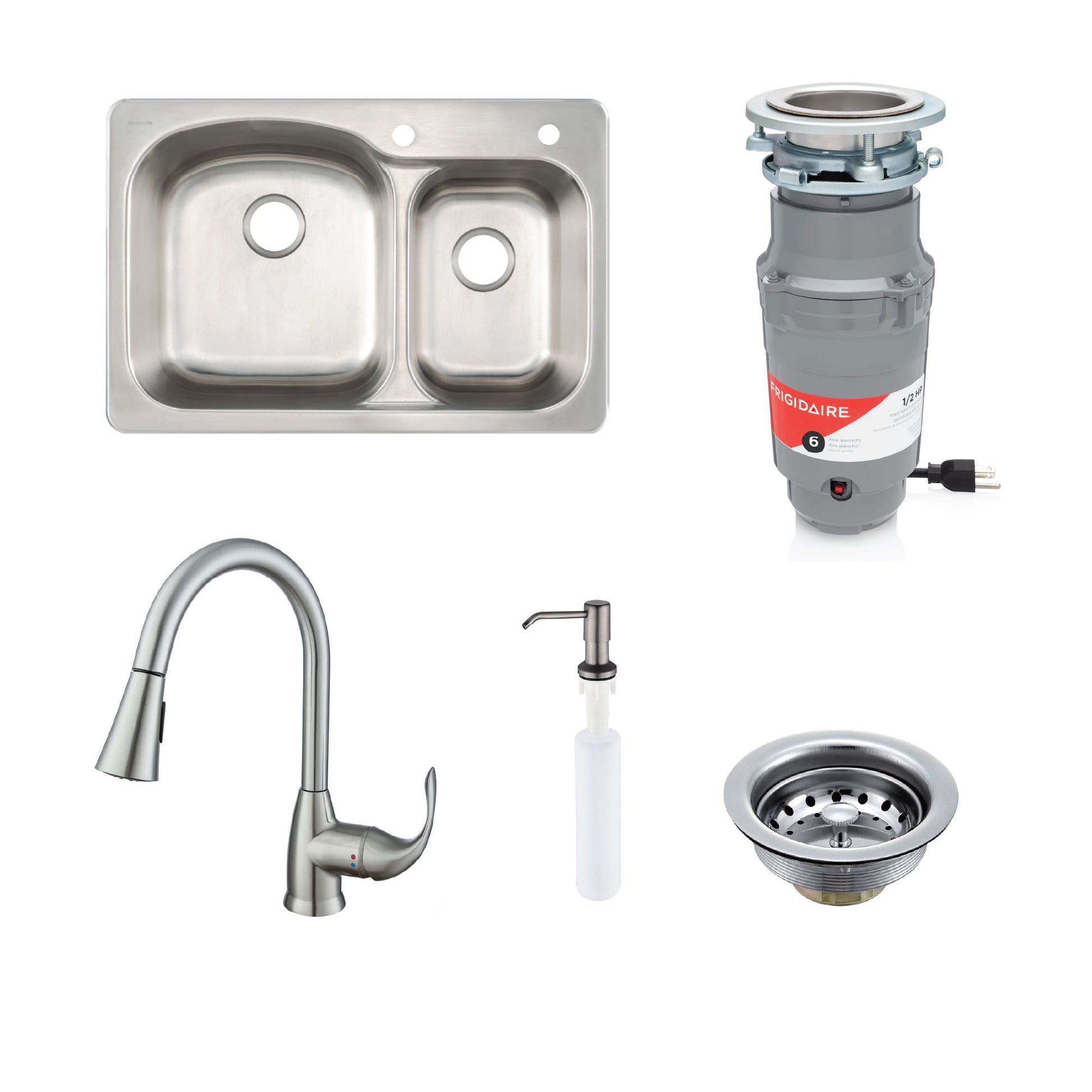Upgrade your kitchen with the all-in-one Frigidaire Kitchen Essentials Bundle, featuring a powerful 1/2 HP food waste disposer, a sleek dual-mount stainless steel sink, a modern single-handle faucet, a durable basket strainer, and a built-in soap dispenser. This complete set combines style, performance, and convenience—perfect for remodels, new installations, or anyone looking for a streamlined kitchen upgrade. Enjoy quality craftsmanship from trusted brands with everything you need in one affordable package.