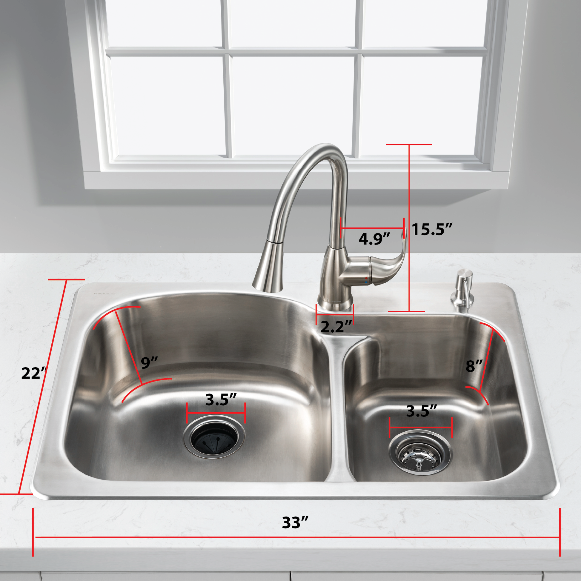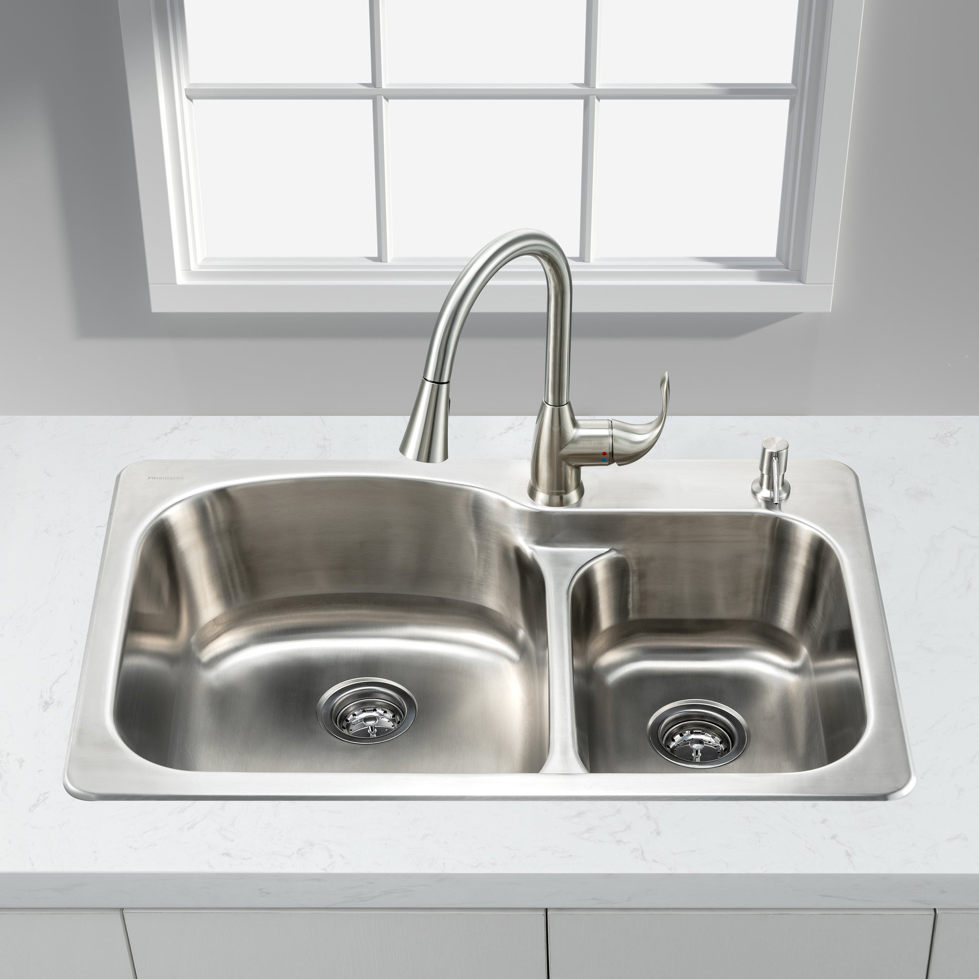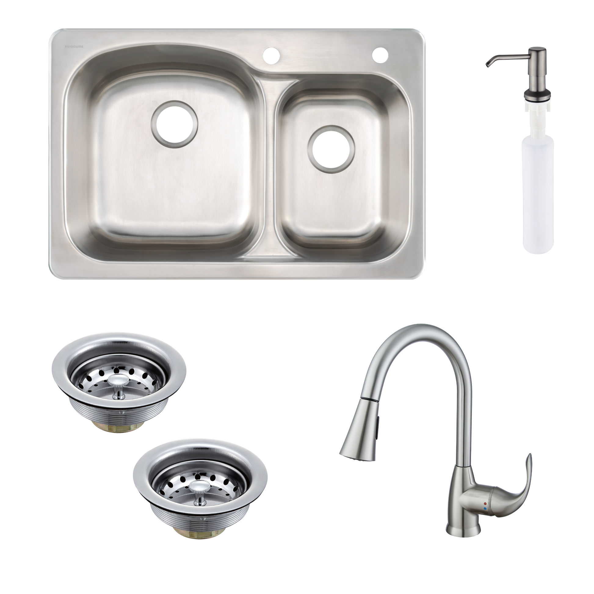 Upgrade your kitchen with the all-in-one Frigidaire Kitchen Essentials Bundle, a sleek dual-mount stainless steel sink, a modern single-handle faucet, two basket strainers, and a built-in soap dispenser. This complete set combines style, performance, and convenience—perfect for remodels, new installations, or anyone looking for a streamlined kitchen upgrade. Enjoy quality craftsmanship from trusted brands with everything you need in one affordable package.
